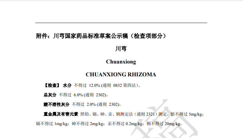 本次草案修訂,主要是根據(jù)產(chǎn)品重金屬及有害元素蓄積及與土壤相關(guān)性研究結(jié)果,擬新增重金屬與有害元素檢查項。均要求【重金屬及有害元素】照鉛、鎘、砷、汞、銅測定法(通則2321)測定,鉛不得過 5mg/kg;鎘不得過1mg/kg;砷不得過2mg/kg;汞不得過 0.2mg/kg;銅不得過 20mg/kg。