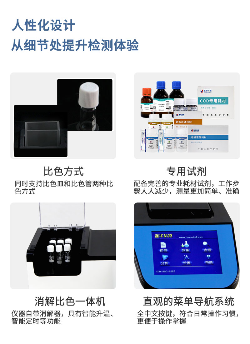 4、具有多光路無干涉系統,可測定COD、氨氮、總磷和濁度。同時支持皿比色和管比色兩種比色方式;