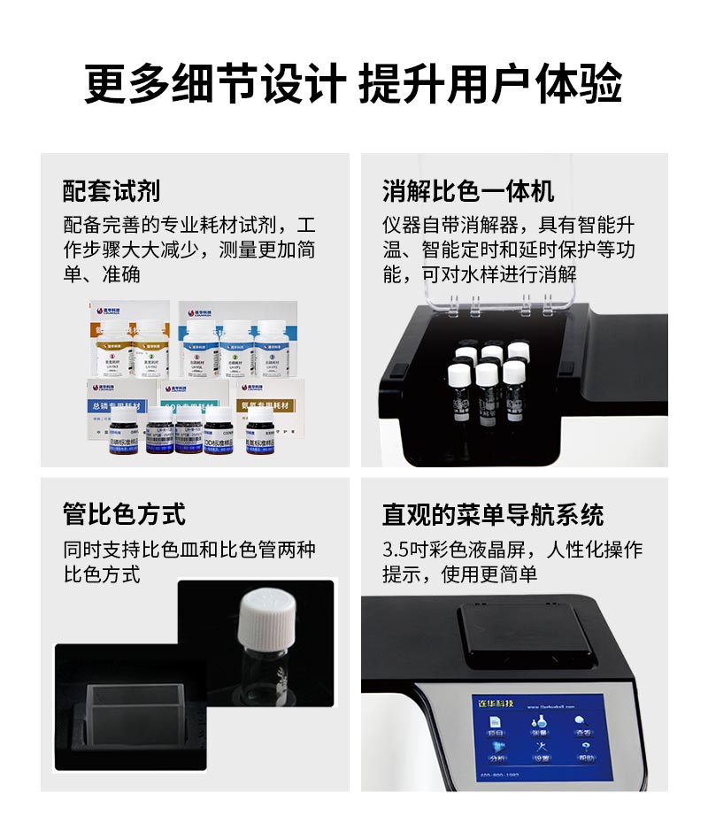 3.自帶消解器:儀器自帶消解器,具有智能升溫、智能定時(shí)和延時(shí)保護(hù)等功能,可對(duì)水樣進(jìn)行消解;